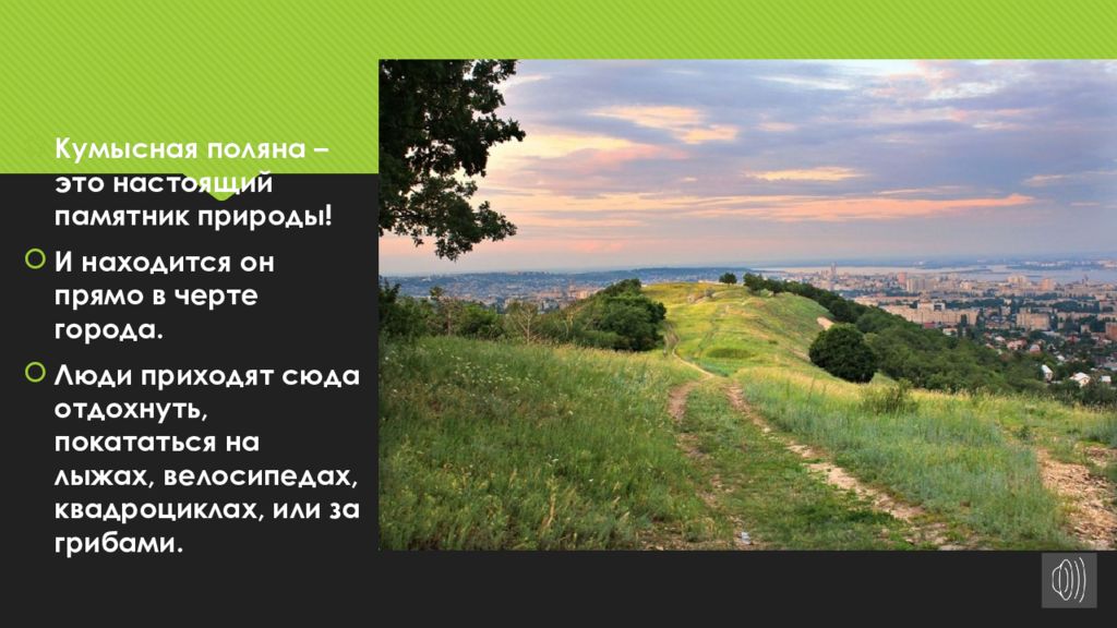Кумысная поляна – это настоящий памятник природы! И находится он прямо в черте города. Люди приходят сюда отдохнуть, покататься на лыжах, велосипедах, квадроциклах, или за грибами.