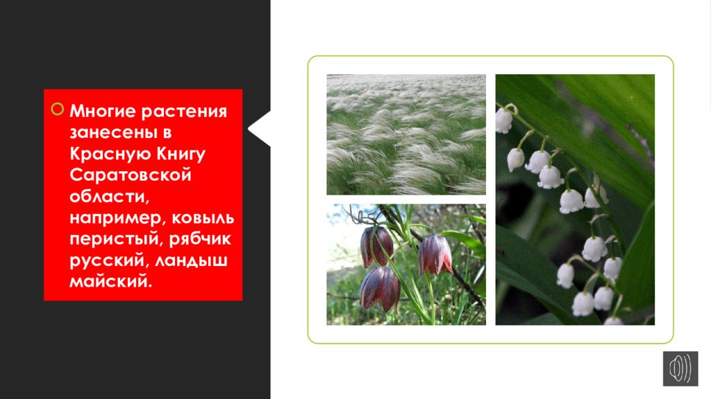 Многие растения занесены в Красную Книгу Саратовской области, например, ковыль перистый, рябчик русский, ландыш майский.