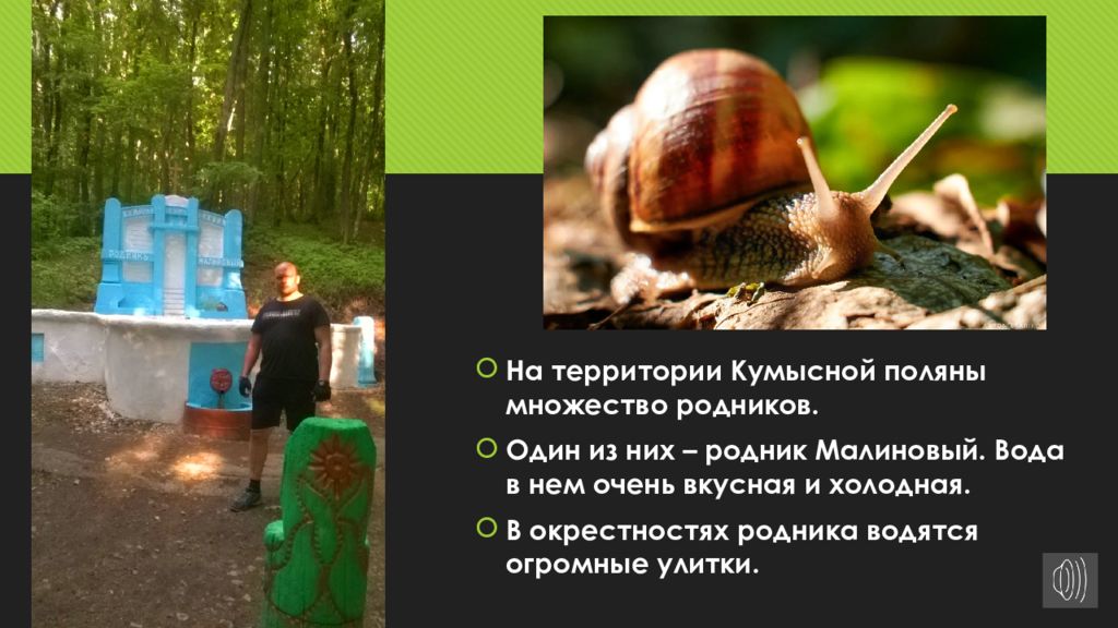 На территории Кумысной поляны множество родников. Один из них – родник Малиновый. Вода в нем очень вкусная и холодная. В окрестностях родника водятся огромные улитки.