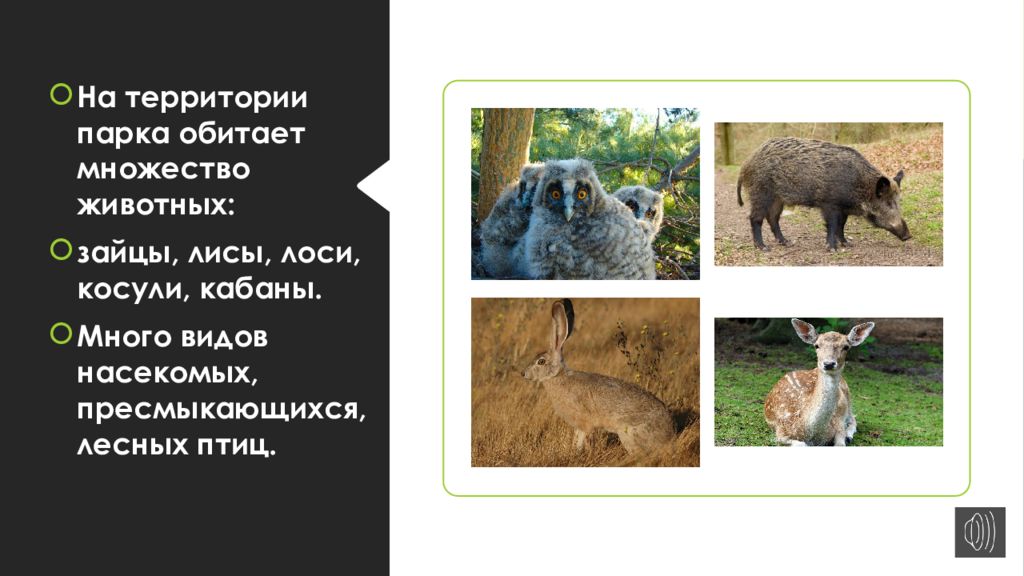 На территории парка обитает множество животных: зайцы, лисы, лоси, косули, кабаны. Много видов насекомых, пресмыкающихся, лесных птиц.
