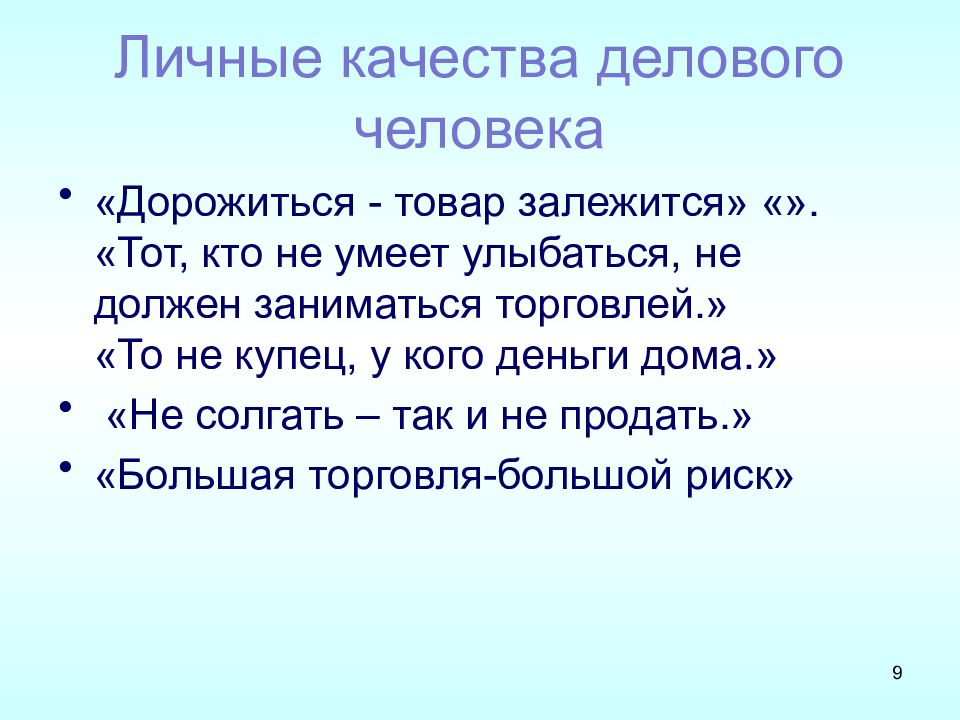 «Дорожиться - товар залежится» «». «Тот, кто не умеет улыбаться, не должен заниматься торговлей.» «То не купец, у кого деньги дома.» «Не солгать – так и не продать.» «Большая торговля-большой риск» 9