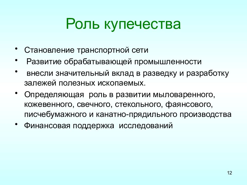 Становление транспортной сети Развитие обрабатывающей промышленности внесли значительный вклад в разведку и разработку залежей полезных ископаемых. Определяющая роль в развитии мыловаренного, кожевенного, свечного, стекольного, фаянсового, писчебумажного и канатно-прядильного производства Финансовая поддержка исследований 12
