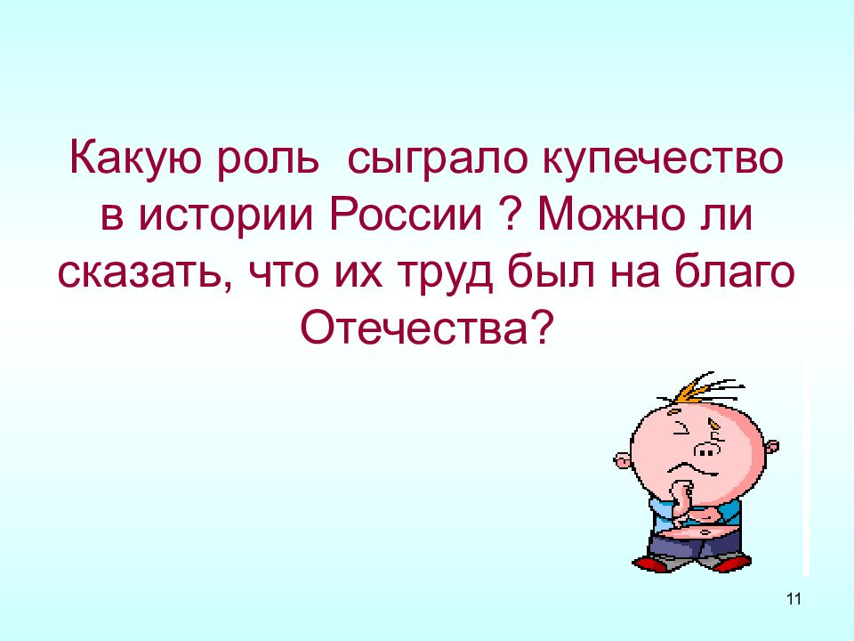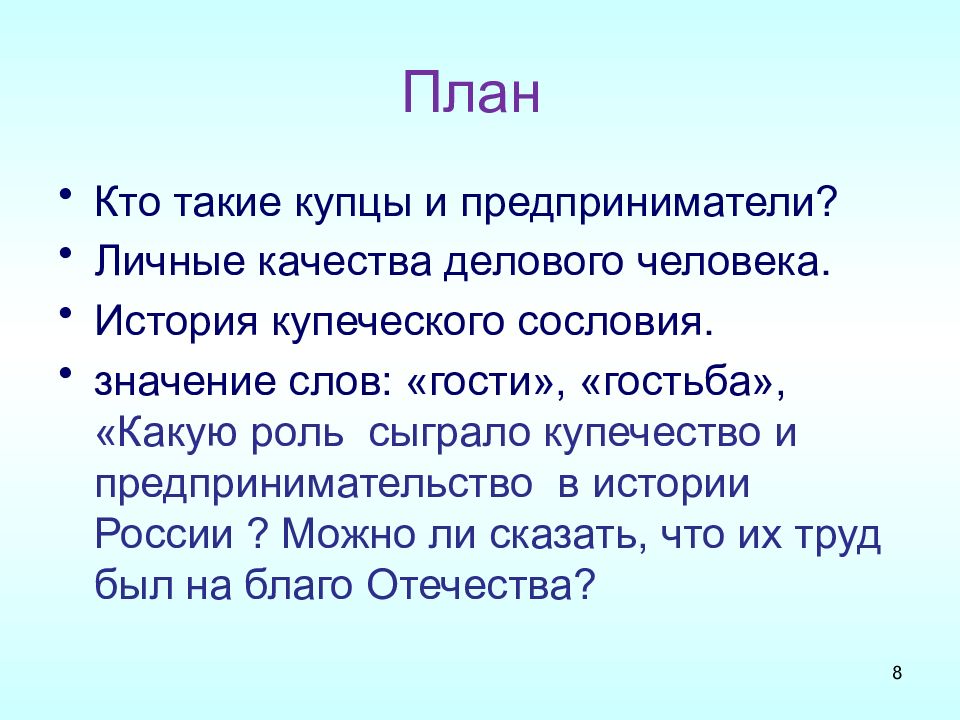 Кто такие купцы и предприниматели? Личные качества делового человека. История купеческого сословия. значение слов: «гости», « гостьба », «Какую роль сыграло купечество и предпринимательство в истории России ? Можно ли сказать, что их труд был на благо Отечества? 8