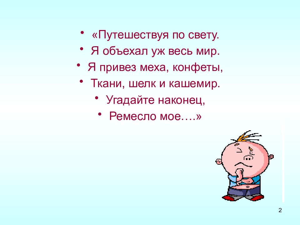 2 «Путешествуя по свету. Я объехал уж весь мир. Я привез меха, конфеты, Ткани, шелк и кашемир. Угадайте наконец, Ремесло мое….»