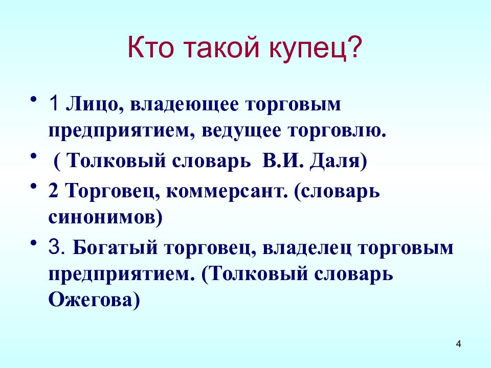 1 Лицо, владеющее торговым предприятием, ведущее торговлю. ( Толковый словарь В.И. Даля) 2 Торговец, коммерсант. (словарь синонимов) 3. Богатый торговец, владелец торговым предприятием. (Толковый словарь Ожегова) 4