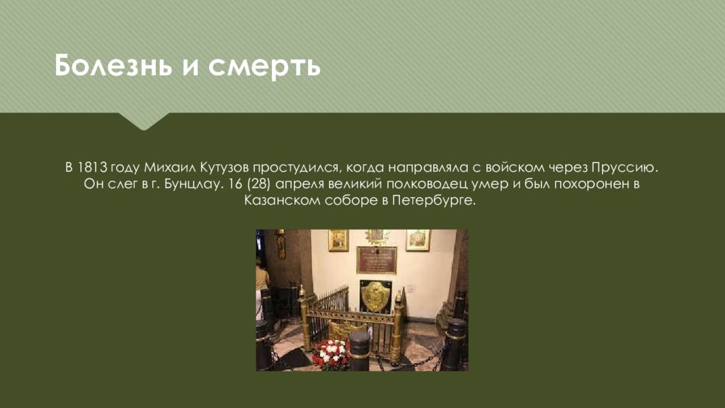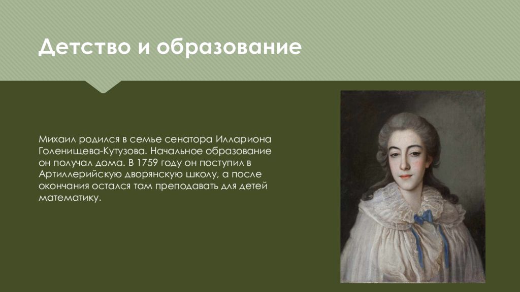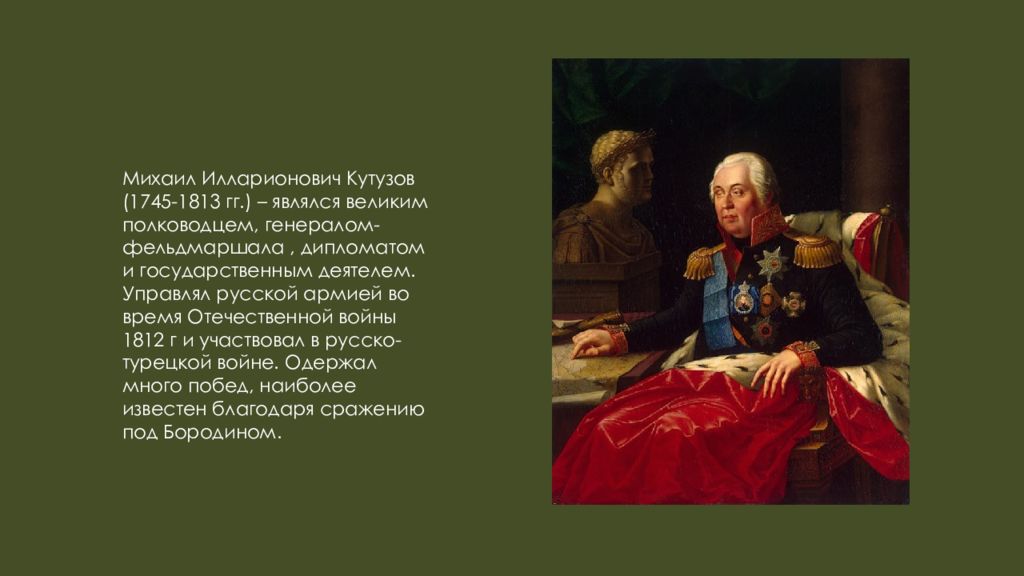 Михаил Илларионович Кутузов (1745-1813 гг.) – являлся великим полководцем, генералом-фельдмаршала, дипломатом и государственным деятелем. Управлял русской армией во время Отечественной войны 1812 г и участвовал в русско-турецкой войне. Одержал м ного побед, наиболее известен благодаря сражению под Бородином.