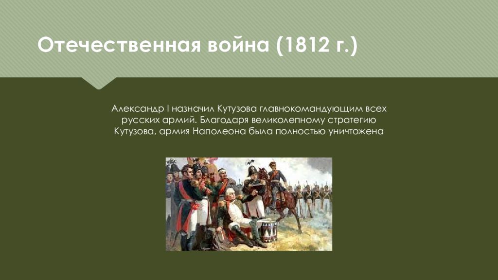 Александр I назначил Кутузова главнокомандующим всех русских армий. Благодаря великолепному стратегию Кутузова, армия Наполеона была полностью уничтожена