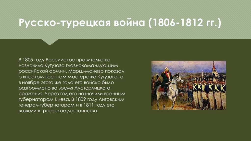 В 1805 году Российское правительство назначило Кутузова главнокомандующим российской армии. Марш-маневр показал о высоком военном мастерстве Кутузова, а в ноябре этого же года его войско было разгромлено во время Аустерлицкого сражения. Через год его назначили военным губернатором Киева. В 1809 году Литовским генерал-губернатором и в 1811 году его возвели в графское достоинство.