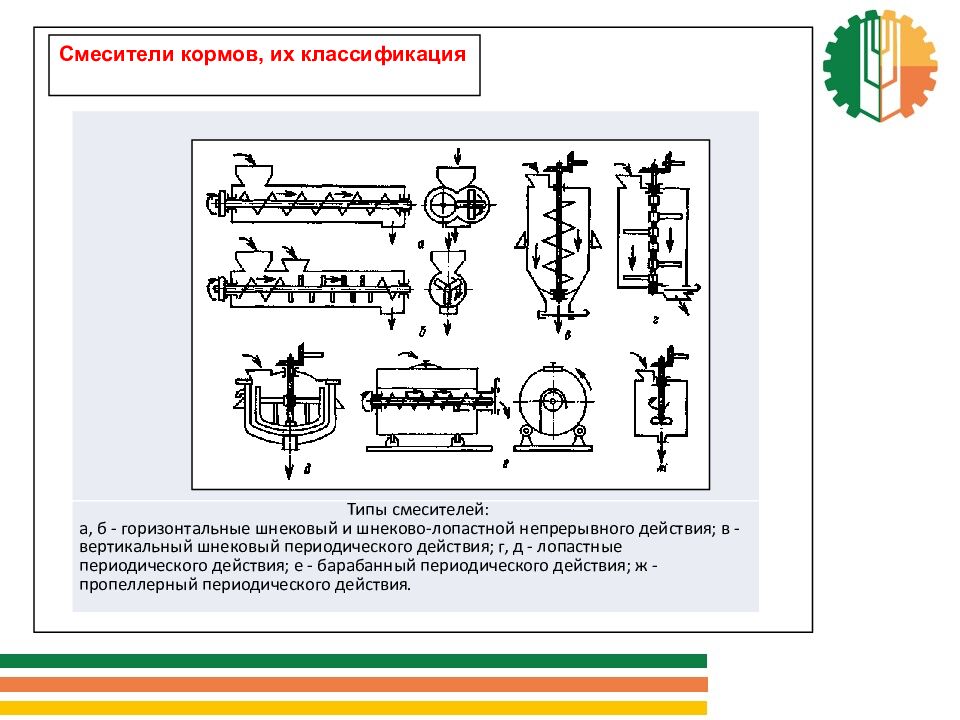 Смесители кормов, их классификация Типы смесителей: а, б - горизонтальные шнековый и шнеково-лопастной непрерывного действия; в - вертикальный шнековый периодического действия; г, д - лопастные периодического действия; е - барабанный периодического действия; ж - пропеллерный периодического действия.