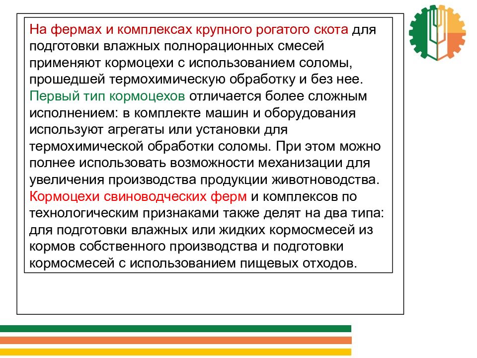 На фермах и комплексах крупного рогатого скота для подготовки влажных полнорационных смесей применяют кормоцехи с использованием соломы, прошедшей термохимическую обработку и без нее. Первый тип кормоцехов отличается более сложным исполнением: в комплекте машин и оборудования используют агрегаты или установки для термохимической обработки соломы. При этом можно полнее использовать возможности механизации для увеличения производства продукции животноводства. Кормоцехи свиноводческих ферм и комплексов по технологическим признаками также делят на два типа: для подготовки влажных или жидких кормосмесей из кормов собственного производства и подготовки кормосмесей с использованием пищевых отходов.