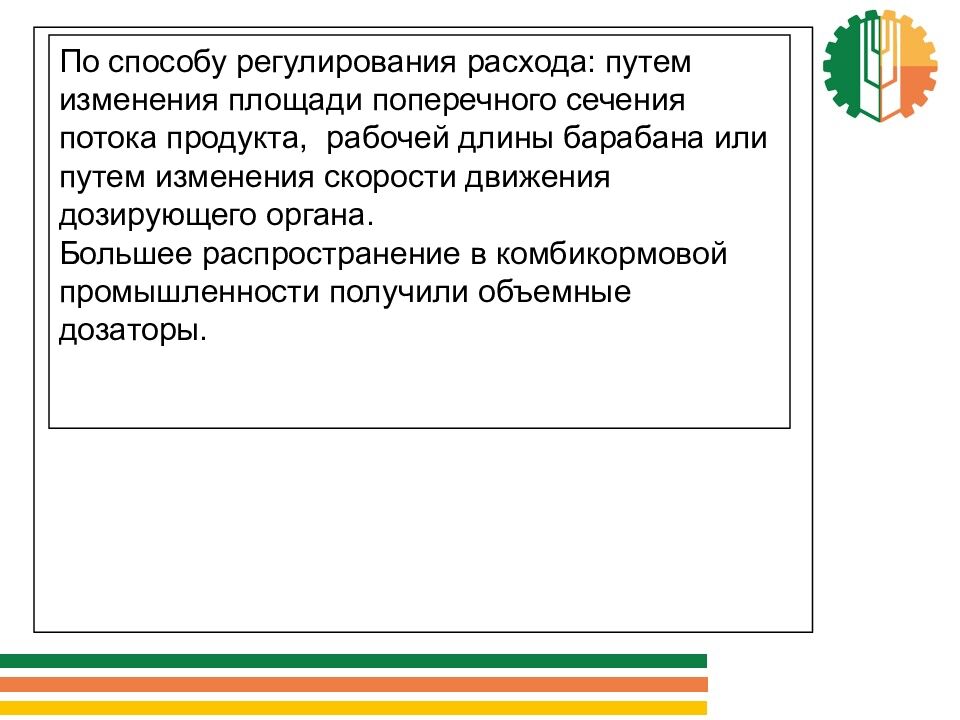 По способу регулирования расхода: путем изменения площади поперечного сечения потока продукта, рабочей длины барабана или путем изменения скорости движения дозирующего органа. Большее распространение в комбикормовой промышленности получили объемные дозаторы.