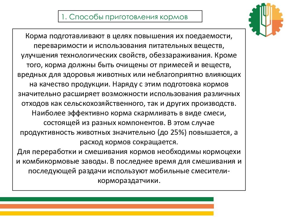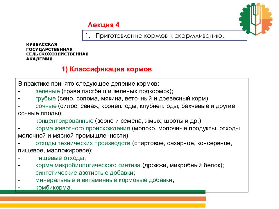 КУЗБАССКАЯ ГОСУДАРСТВЕННАЯ СЕЛЬСКОХОЗЯЙСТВЕННАЯ АКАДЕМИЯ Лекция 4 Приготовление кормов к скармливанию. В практике принято следующее деление кормов: - зеленые (трава пастбищ и зеленых подкормок); - грубые (сено, солома, мякина, веточный и древесный корм); - сочные (силос, сенаж, корнеплоды, клубнеплоды, бахчевые и другие сочные плоды); - концентрированные (зерно и семена, жмых, шроты и др.); - корма животного происхождения (молоко, молочные продукты, отходы молочной и мясной промышленности); - отходы технических производств (спиртовое, сахарное, консервное, пищевое, масложировое); - пищевые отходы ; - корма микробиологического синтеза (дрожжи, микробный белок); - синтетические азотистые добавки ; - минеральные и витаминные кормовые добавки ; - комбикорма. 1) Классификация кормов