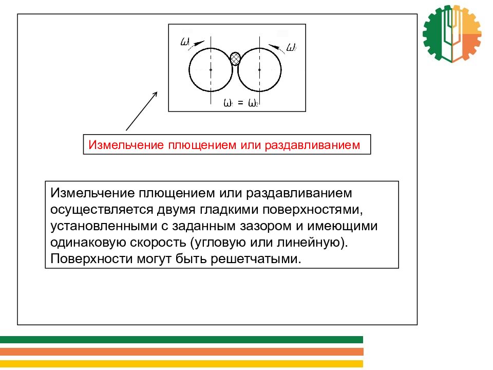 Измельчение плющением или раздавливанием Измельчение плющением или раздавливанием осуществляется двумя гладкими поверхностями, установленными с заданным зазором и имеющими одинаковую скорость (угловую или линейную). Поверхности могут быть решетчатыми.