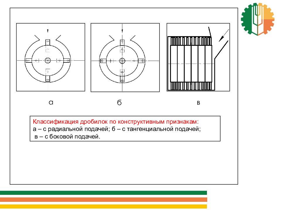 Классификация дробилок по конструктивным признакам: а – с радиальной подачей; б – с тангенциальной подачей; в – с боковой подачей. а б в