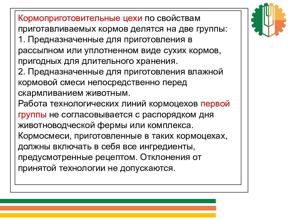 Кормоприготовительные цехи по свойствам приготавливаемых кормов делятся на две группы: 1. Предназначенные для приготовления в рассыпном или уплотненном виде сухих кормов, пригодных для длительного хранения. 2. Предназначенные для приготовления влажной кормовой смеси непосредственно перед скармливанием животным. Работа технологических линий кормоцехов первой группы не согласовывается с распорядком дня животноводческой фермы или комплекса. Кормосмеси, приготовленные в таких кормоцехах, должны включать в себя все ингредиенты, предусмотренные рецептом. Отклонения от принятой технологии не допускаются.