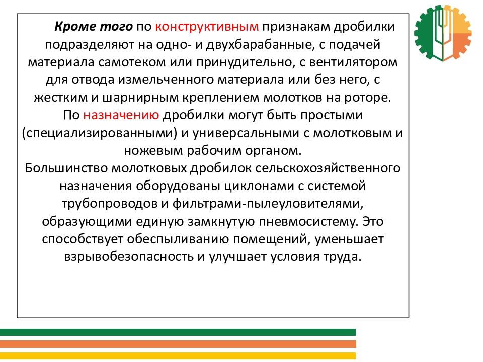 Слайд 18: Кроме того по конструктивным признакам дробилки подразделяют на одно- и двухбарабанные, с подачей материала самотеком или принудительно, с вентилятором для отвода измельченного материала или без него, с жестким и шарнирным креплением молотков на роторе. По назначению дробилки могут быть простыми (специализированными) и универсальными с молотковым и ножевым рабочим органом. Большинство молотковых дробилок сельскохозяйственного назначения оборудованы циклонами с системой трубопроводов и фильтрами-пылеуловителями, образующими единую замкнутую пневмосистему. Это способствует обеспыливанию помещений, уменьшает взрывобезопасность и улучшает условия труда