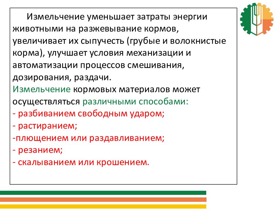 Слайд 9: Измельчение уменьшает затраты энергии животными на разжевывание кормов, увеличивает их сыпучесть (грубые и волокнистые корма), улучшает условия механизации и автоматизации процессов смешивания, дозирования, раздачи. Измельчение кормовых материалов может осуществляться различными способами: - разбиванием свободным ударом; - растиранием; -плющением или раздавливанием; - резанием; - скалыванием или крошением