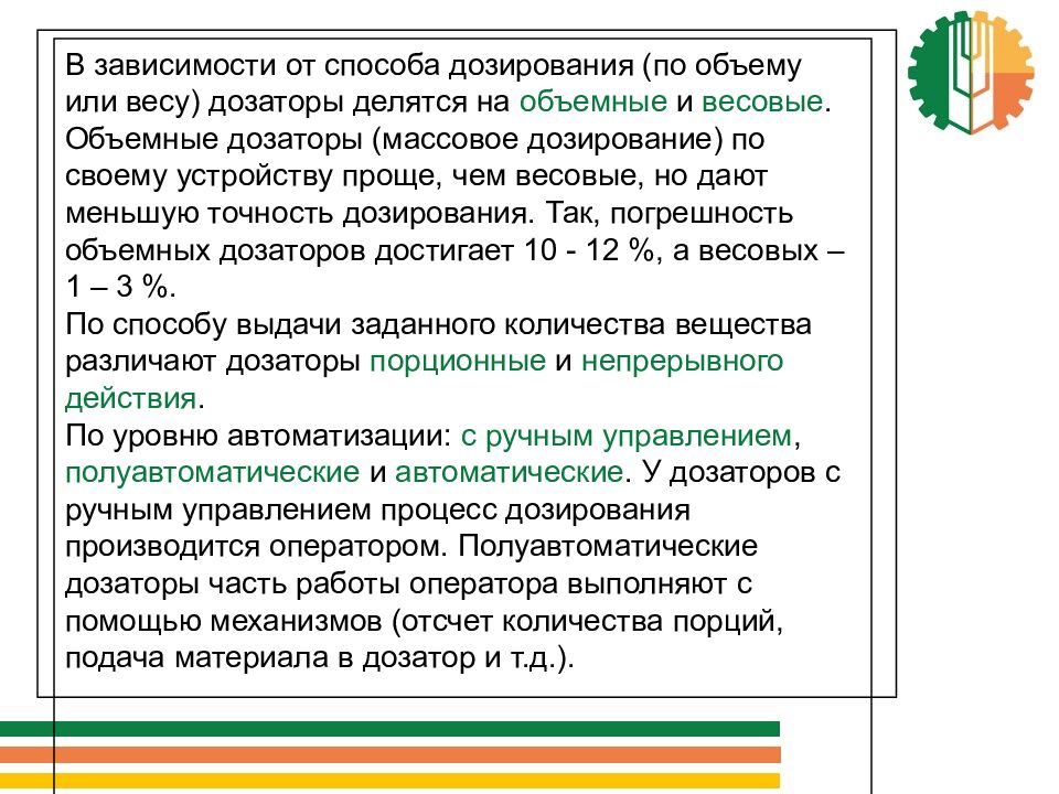 В зависимости от способа дозирования (по объему или весу) дозаторы делятся на объемные и весовые. Объемные дозаторы (массовое дозирование) по своему устройству проще, чем весовые, но дают меньшую точность дозирования. Так, погрешность объемных дозаторов достигает 10 - 12 %, а весовых – 1 – 3 %. По способу выдачи заданного количества вещества различают дозаторы порционные и непрерывного действия. По уровню автоматизации: с ручным управлением, полуавтоматические и автоматические. У дозаторов с ручным управлением процесс дозирования производится оператором. Полуавтоматические дозаторы часть работы оператора выполняют с помощью механизмов (отсчет количества порций, подача материала в дозатор и т.д.).