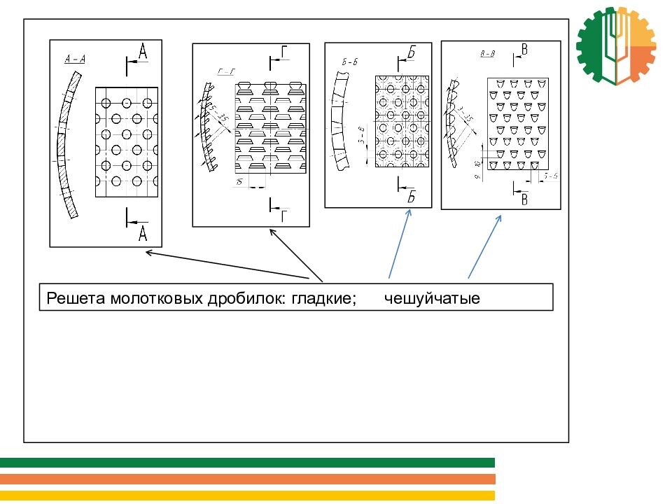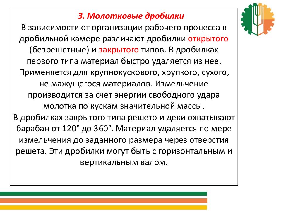 Слайд 16: 3. Молотковые дробилки В зависимости от организации рабочего процесса в дробильной камере различают дробилки открытого ( безрешетные ) и закрытого типов. В дробилках первого типа материал быстро удаляется из нее. Применяется для крупнокускового, хрупкого, сухого, не мажущегося материалов. Измельчение производится за счет энергии свободного удара молотка по кускам значительной массы. В дробилках закрытого типа решето и деки охватывают барабан от 120° до 360°. Материал удаляется по мере измельчения до заданного размера через отверстия решета. Эти дробилки могут быть с горизонтальным и вертикальным валом