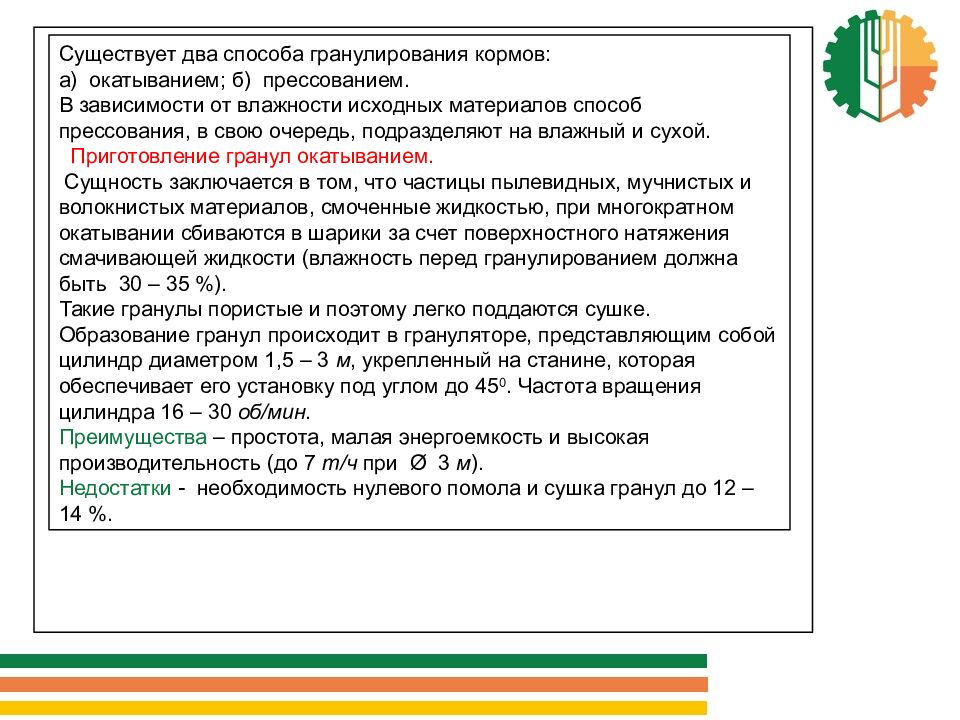Существует два способа гранулирования кормов: а) окатыванием ; б) прессованием. В зависимости от влажности исходных материалов способ прессования, в свою очередь, подразделяют на влажный и сухой. Приготовление гранул окатыванием. Сущность заключается в том, что частицы пылевидных, мучнистых и волокнистых материалов, смоченные жидкостью, при многократном окатывании сбиваются в шарики за счет поверхностного натяжения смачивающей жидкости (влажность перед гранулированием должна быть 30 – 35 %). Такие гранулы пористые и поэтому легко поддаются сушке. Образование гранул происходит в грануляторе, представляющим собой цилиндр диаметром 1,5 – 3 м, укрепленный на станине, которая обеспечивает его установку под углом до 45 0. Частота вращения цилиндра 16 – 30 об/мин. Преимущества – простота, малая энергоемкость и высокая производительность (до 7 т/ч при Ø 3 м ). Недостатки - необходимость нулевого помола и сушка гранул до 12 – 14 %.