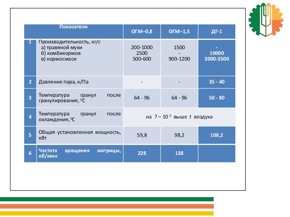 Показатели ОГМ–0,8 ОГМ–1,5 ДГ-1 1 Производительность, кг/с а) травяной муки б) комбикормов в) кормосмеси 200-1000 2500 500-600 1500 - 900-1200 - 10000 2000-3500 2 Давление пара, к/Па - - 35 - 40 3 Температура гранул после гранулирования, 0 С 64 - 96 64 - 96 50 - 80 4 Температура гранул после охлаждения, 0 С на 7 – 10 0 выше t воздуха 5 Общая установленная мощность, кВт 59,8 98,2 108,2 6 Частота вращения матрицы, об/мин 228 138