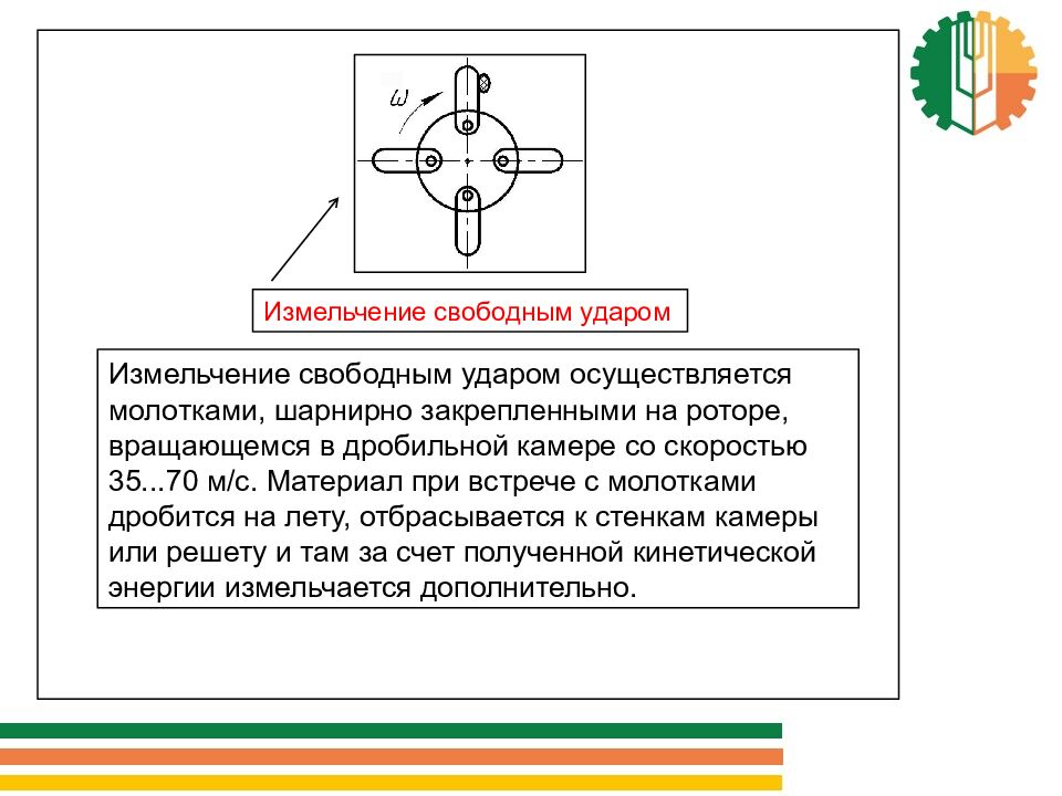 Измельчение свободным ударом Измельчение свободным ударом осуществляется молотками, шарнирно закрепленными на роторе, вращающемся в дробильной камере со скоростью 35...70 м/с. Материал при встрече с молотками дробится на лету, отбрасывается к стенкам камеры или решету и там за счет полученной кинетической энергии измельчается дополнительно.