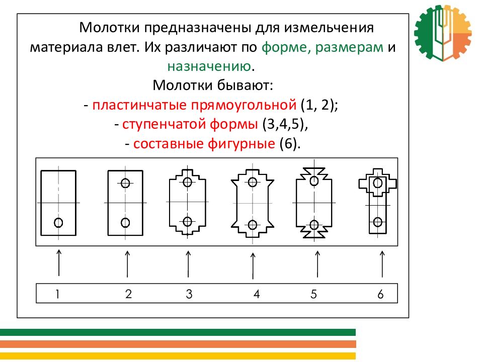 Слайд 20: Молотки предназначены для измельчения материала влет. Их различают по форме, размерам и назначению. Молотки бывают: - пластинчатые прямоугольной (1, 2); - ступенчатой формы (3,4,5), - составные фигурные (6)