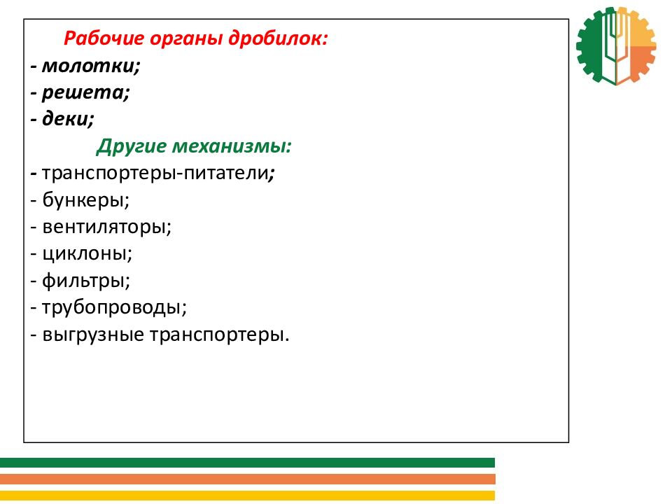 Слайд 19: Рабочие органы дробилок: - молотки; - решета; - деки; Другие механизмы: - транспортеры-питатели ; - бункеры; - вентиляторы; - циклоны; - фильтры; - трубопроводы; - выгрузные транспортеры