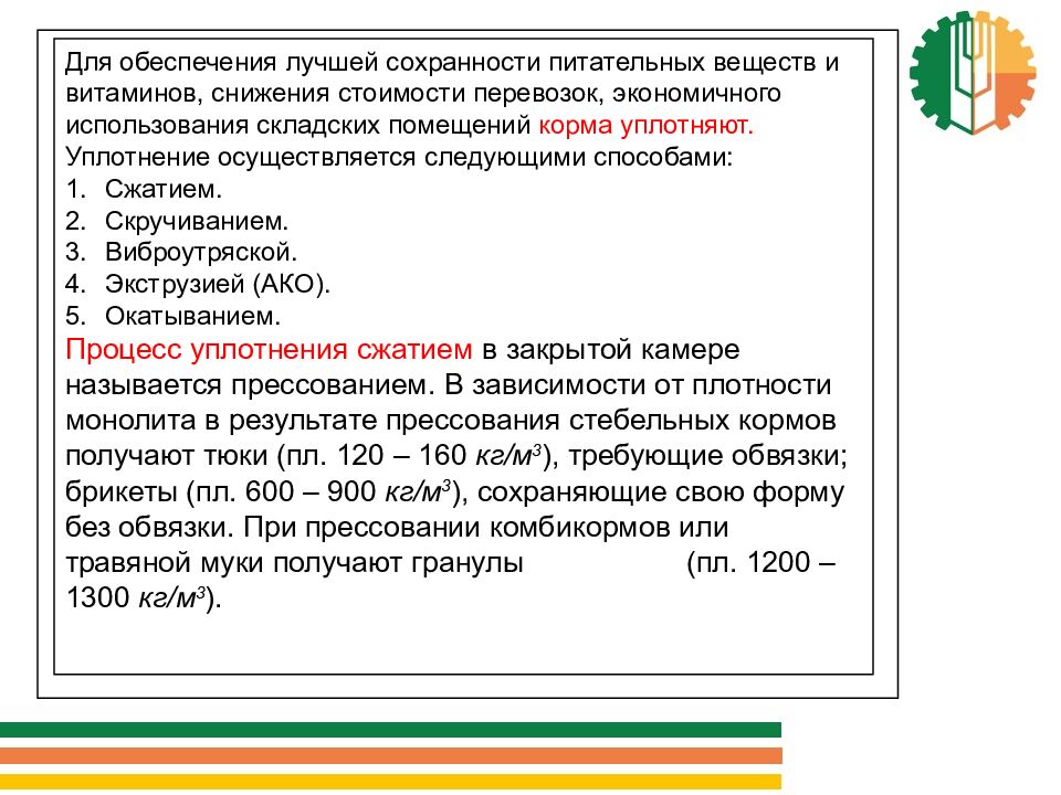 Для обеспечения лучшей сохранности питательных веществ и витаминов, снижения стоимости перевозок, экономичного использования складских помещений корма уплотняют. Уплотнение осуществляется следующими способами: с жатием. с кручиванием. в иброутряской. э кструзией (АКО). о катыванием. Процесс уплотнения сжатием в закрытой камере называется прессованием. В зависимости от плотности монолита в результате прессования стебельных кормов получают тюки (пл. 120 – 160 кг/м 3 ), требующие обвязки; брикеты (пл. 600 – 900 кг/м 3 ), сохраняющие свою форму без обвязки. При прессовании комбикормов или травяной муки получают гранулы (пл. 1200 – 1300 кг/м 3 ).
