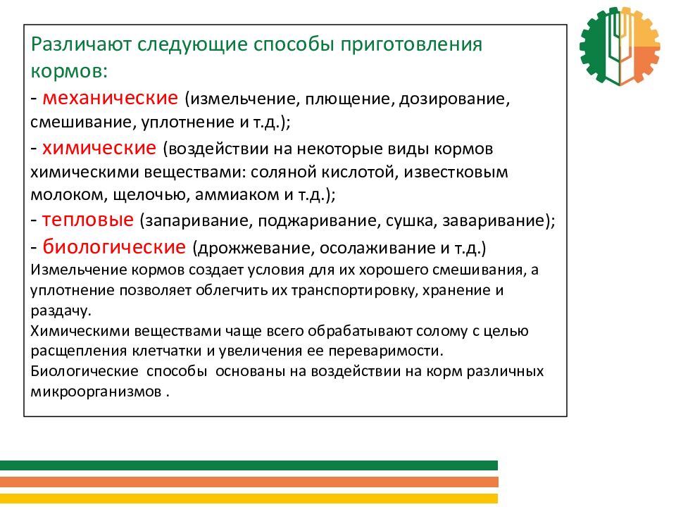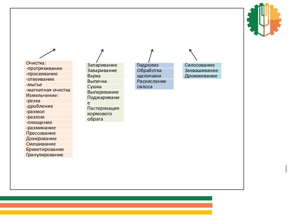 Очистка: - протряхивание -просеивание - отвеивание -мытье -магнитная очистка Измельчение: -резка -дробление -размол -разлом -плющение -разминание Прессование Дозирование Смешивание Брикетирование Гранулирование Запаривание Заваривание Варка Выпечка Сушка Выпаривание Поджаривание Пастеризация кормового обрата Гидролиз Обработка щелочами Раскисление силоса Силосование Заквашивание Дрожжевание
