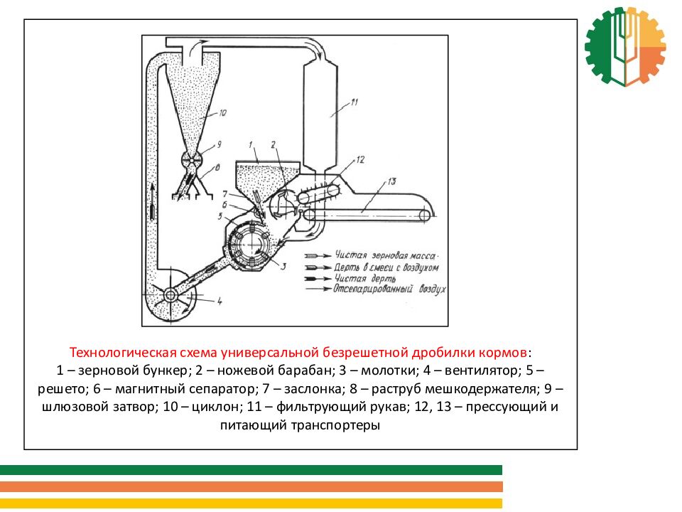 Слайд 22: Технологическая схема универсальной безрешетной дробилки кормов : 1 – зерновой бункер; 2 – ножевой барабан; 3 – молотки; 4 – вентилятор; 5 – решето; 6 – магнитный сепаратор; 7 – заслонка; 8 – раструб мешкодержателя ; 9 – шлюзовой затвор; 10 – циклон; 11 – фильтрующий рукав; 12, 13 – прессующий и питающий транспортеры
