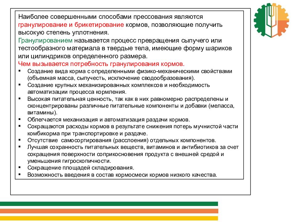 Наиболее совершенными способами прессования являются гранулирование и брикетирование кормов, позволяющие получить высокую степень уплотнения. Гранулированием называется процесс превращения сыпучего или тестообразного материала в твердые тела, имеющие форму шариков или цилиндриков определенного размера. Чем вызывается потребность гранулирования кормов. Создание вида корма с определенными физико-механическими свойствами (объемная масса, сыпучесть, исключение сводообразования ). Создание крупных механизированных комплексов и необходимость автоматизации процесса кормления. Высокая питательная ценность, так как в них равномерно распределены и сконцентрированы различные питательные компоненты и добавки (меласса, витамины). Облегчается механизация и автоматизация раздачи кормов. Сокращаются расходы кормов в результате снижения потерь мучнистой части комбикорма при транспортировке и раздаче. Отсутствие самосортирования (расслоения) отдельных компонентов. Лучшая сохранность питательных веществ, витаминов и антибиотиков за счет сокращения поверхности соприкосновения продукта с внешней средой и уменьшения гигроскопичности. Сокращение площадей складирования. Возможность введения в состав кормосмеси кормов низкого качества.