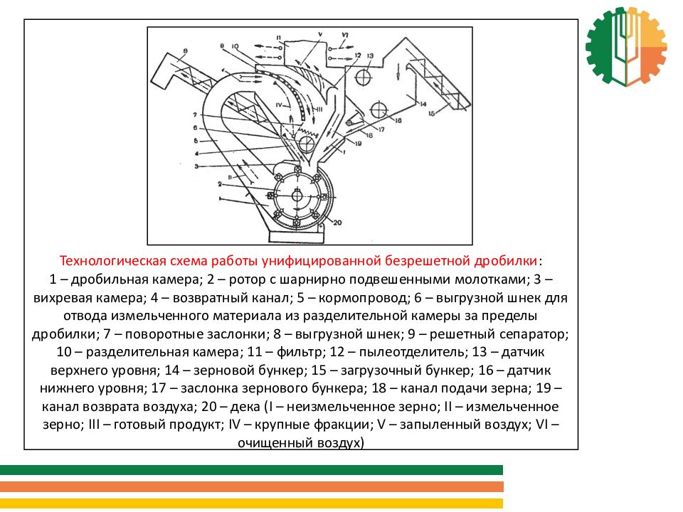 Слайд 23: Технологическая схема работы унифицированной безрешетной дробилки : 1 – дробильная камера; 2 – ротор с шарнирно подвешенными молотками; 3 – вихревая камера; 4 – возвратный канал; 5 – кормопровод; 6 – выгрузной шнек для отвода измельченного материала из разделительной камеры за пределы дробилки; 7 – поворотные заслонки; 8 – выгрузной шнек; 9 – решетный сепаратор; 10 – разделительная камера; 11 – фильтр; 12 – пылеотделитель ; 13 – датчик верхнего уровня; 14 – зерновой бункер; 15 – загрузочный бункер; 16 – датчик нижнего уровня; 17 – заслонка зернового бункера; 18 – канал подачи зерна; 19 – канал возврата воздуха; 20 – дека (I – неизмельченное зерно; II – измельченное зерно; III – готовый продукт; IV – крупные фракции; V – запыленный воздух; VI – очищенный воздух)