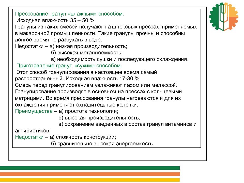Прессование гранул «влажным» способом. Исходная влажность 35 – 50 %. Гранулы из таких смесей получают на шнековых прессах, применяемых в макаронной промышленности. Такие гранулы прочны и способны долгое время не разбухать в воде. Недостатки – а) низкая производительность; б) высокая металлоемкость; в) необходимость сушки и последующего охлаждения. Приготовление гранул «сухим» способом. Этот способ гранулирования в настоящее время самый распространенный. Исходная влажность 17-30 %. Смесь перед гранулированием увлажняют паром или мелассой. Гранулирование производят в основном на прессах с кольцевыми матрицами. Во время прессования гранулы нагреваются и для их охлаждения применяют охладитедьные колонки. Преимущества – а) простота технологии; б) высокая производительность; в) сохранение введенных в состав гранул витаминов и антибиотиков; Недостатки – а) сложность конструкции; б) сравнительно высокая энергоемкость.