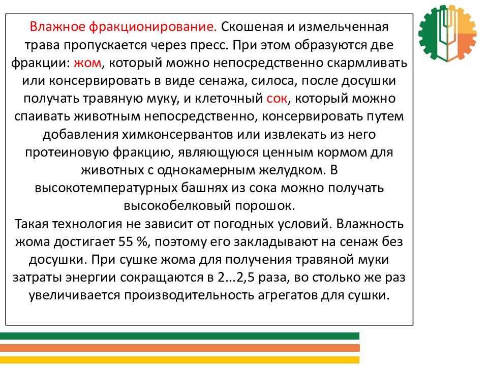Слайд 7: Влажное фракционирование. Скошеная и измельченная трава пропускается через пресс. При этом образуются две фракции: жом, который можно непосредственно скармливать или консервировать в виде сенажа, силоса, после досушки получать травяную муку, и клеточный сок, который можно спаивать животным непосредственно, консервировать путем добавления химконсервантов или извлекать из него протеиновую фракцию, являющуюся ценным кормом для животных с однокамерным желудком. В высокотемпературных башнях из сока можно получать высокобелковый порошок. Такая технология не зависит от погодных условий. Влажность жома достигает 55 %, поэтому его закладывают на сенаж без досушки. При сушке жома для получения травяной муки затраты энергии сокращаются в 2...2,5 раза, во столько же раз увеличивается производительность агрегатов для сушки