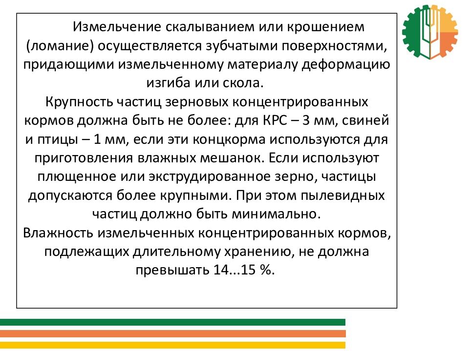 Слайд 15: Измельчение скалыванием или крошением (ломание) осуществляется зубчатыми поверхностями, придающими измельченному материалу деформацию изгиба или скола. Крупность частиц зерновых концентрированных кормов должна быть не более: для КРС – 3 мм, свиней и птицы – 1 мм, если эти концкорма используются для приготовления влажных мешанок. Если используют плющенное или экструдированное зерно, частицы допускаются более крупными. При этом пылевидных частиц должно быть минимально. Влажность измельченных концентрированных кормов, подлежащих длительному хранению, не должна превышать 14...15 %