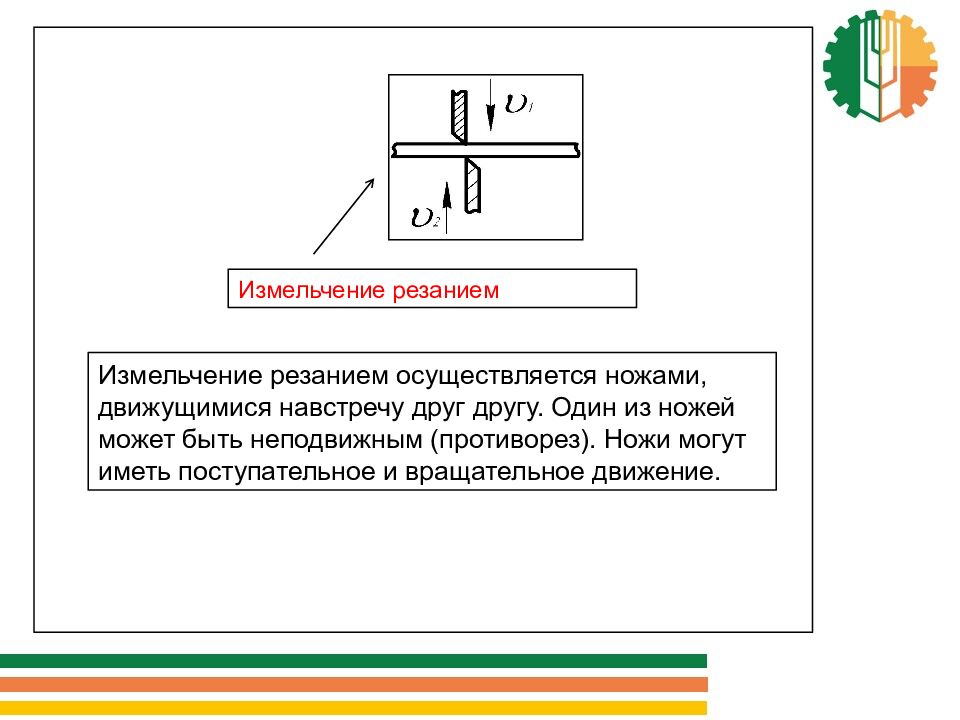 Измельчение резанием Измельчение резанием осуществляется ножами, движущимися навстречу друг другу. Один из ножей может быть неподвижным ( противорез ). Ножи могут иметь поступательное и вращательное движение.