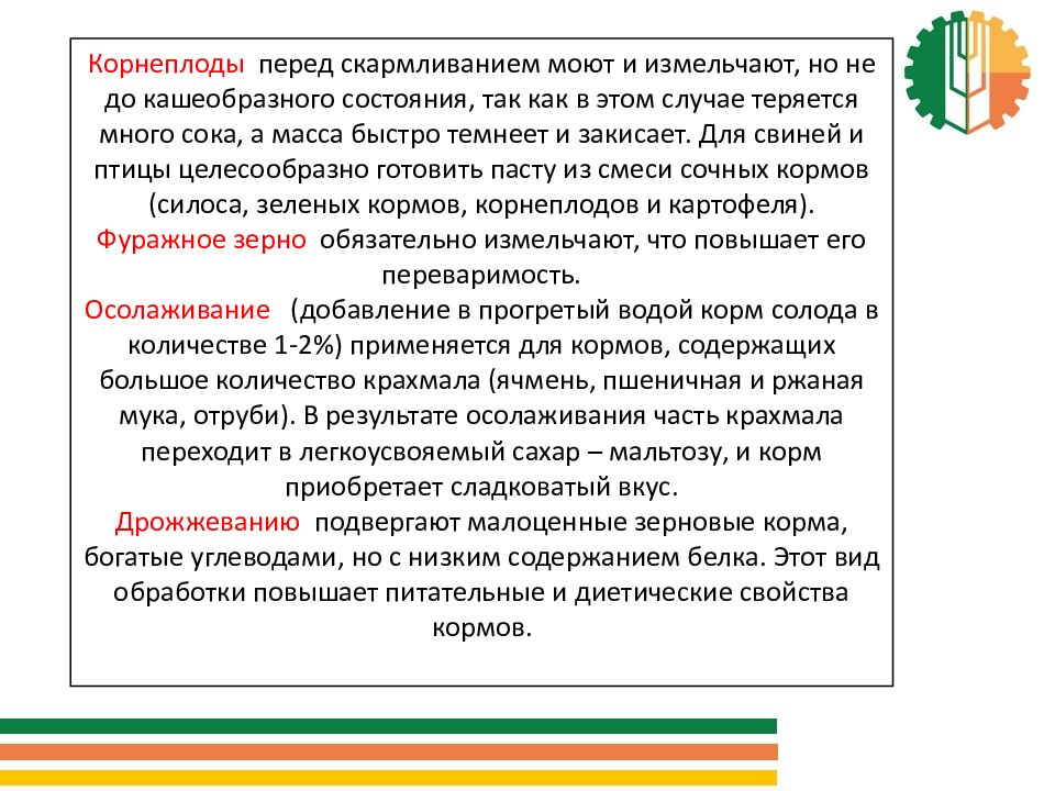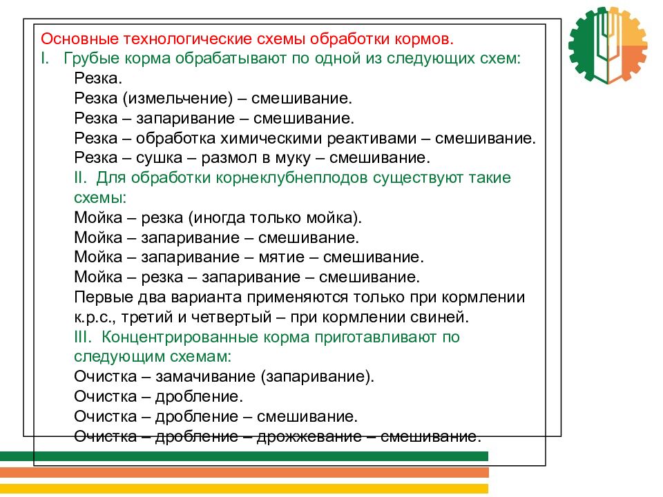о сновные технологические схемы обработки кормов. I. Грубые корма обрабатывают по одной из следующих схем: р езка. р езка (измельчение) – смешивание. р езка – запаривание – смешивание. р езка – обработка химическими реактивами – смешивание. р езка – сушка – размол в муку – смешивание. II. Для обработки корнеклубнеплодов существуют такие схемы: м ойка – резка (иногда только мойка). м ойка – запаривание – смешивание. м ойка – запаривание – мятие – смешивание. м ойка – резка – запаривание – смешивание. Первые два варианта применяются только при кормлении к.р.с., третий и четвертый – при кормлении свиней. III. Концентрированные корма приготавливают по следующим схемам: о чистка – замачивание (запаривание). о чистка – дробление. о чистка – дробление – смешивание. о чистка – дробление – дрожжевание – смешивание.