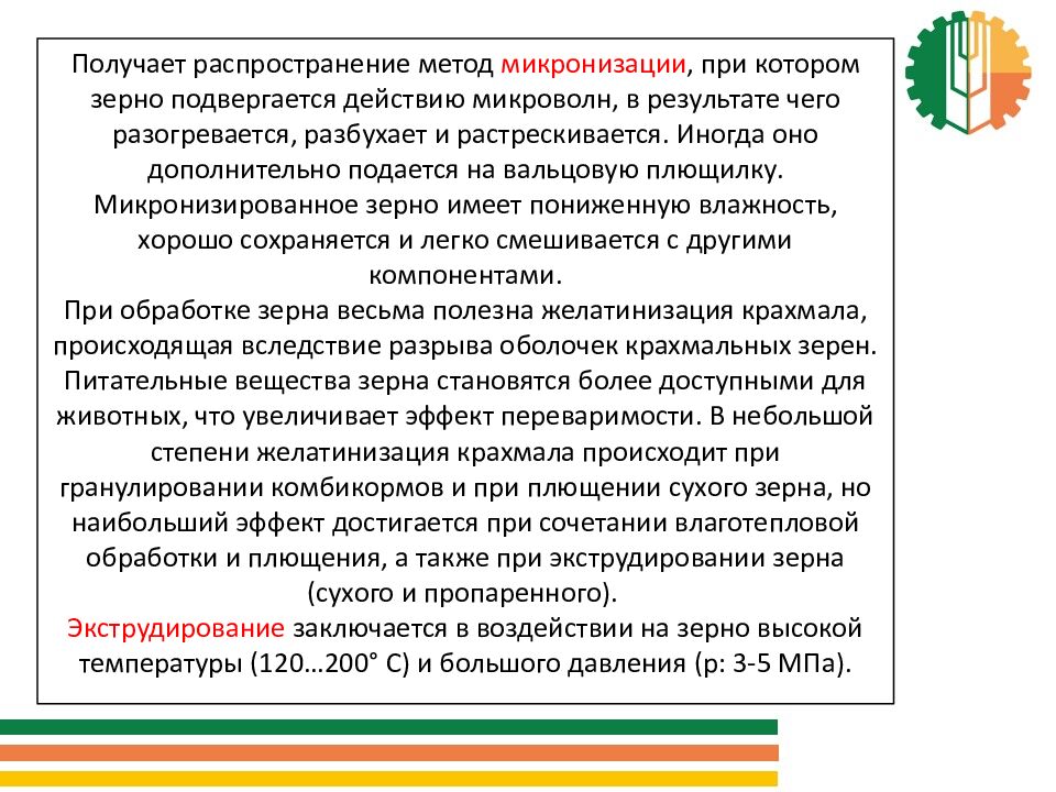 Слайд 6: Получает распространение метод микронизации, при котором зерно подвергается действию микроволн, в результате чего разогревается, разбухает и растрескивается. Иногда оно дополнительно подается на вальцовую плющилку. Микронизированное зерно имеет пониженную влажность, хорошо сохраняется и легко смешивается с другими компонентами. При обработке зерна весьма полезна желатинизация крахмала, происходящая вследствие разрыва оболочек крахмальных зерен. Питательные вещества зерна становятся более доступными для животных, что увеличивает эффект переваримости. В небольшой степени желатинизация крахмала происходит при гранулировании комбикормов и при плющении сухого зерна, но наибольший эффект достигается при сочетании влаготепловой обработки и плющения, а также при экструдировании зерна (сухого и пропаренного). Экструдирование заключается в воздействии на зерно высокой температуры (120…200° С) и большого давления (р: 3-5 МПа)