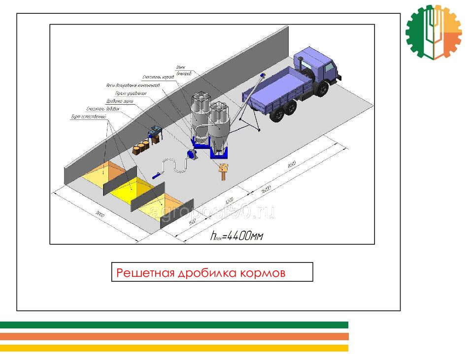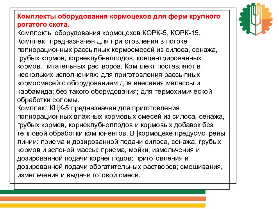 Комплекты оборудования кормоцехов для ферм крупного рогатого скота. Комплекты оборудования кормоцехов КОРК-5, КОРК-15. Комплект предназначен для приготовления в потоке полнорационных рассыпных кормосмесей из силоса, сенажа, грубых кормов, корнеклубнеплодов, концентрированных кормов, питательных растворов. Комплект поставляют в нескольких исполнениях: для приготовления рассыпных кормосмесей с оборудованием для внесения мелассы и карбамида; без такого оборудования; для термохимической обработки соломы. Комплект КЦК-5 предназначен для приготовления полнорационных влажных кормовых смесей из силоса, сенажа, грубых кормов, корнеклубнеплодов и кормовых добавок без тепловой обработки компонентов. В |кормоцехе предусмотрены линии: приема и дозированной подачи силоса, сенажа, грубых кормов и зеленой массы; приема, мойки, измельчения и дозированной подачи корнеплодов; приготовления и дозированной подачи обогатительных растворов; смешивания, измельчения и выдачи готовой смеси.