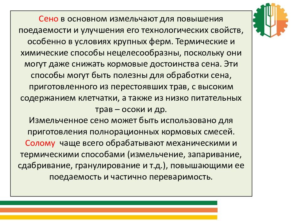 Слайд 8: 2. Приготовление кормов методом измельчения Измельчением называется процесс разделения твердого тела на части механическим путем, т.е. приложением внешних сил, превосходящих силы молекулярного сцепления. В кормоприготовлении измельчению подвергаются зерно злаковых, бобовых и масличных культур, мел, соль, прессованные корма, пищевые отходы, сено, солома, корнеклубнеплоды, зеленая масса трав и т.п. Измельчение играет важную роль в усвоении питательных веществ организмом животных. Чем мельче частица (до определенного предела), тем быстрее она обрабатывается желудочным соком животного и лучше усваивается. Пылевидные частицы комкуются и желудочный сок плохо проникает внутрь этих комков