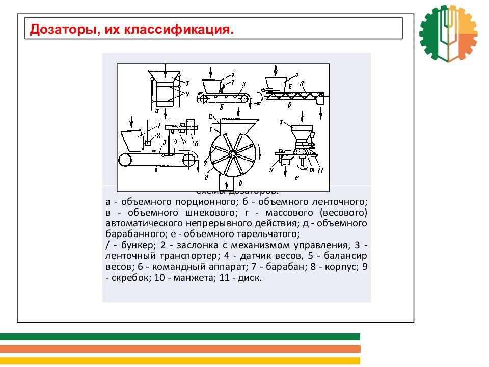 Дозаторы, их классификация. Схемы дозаторов: а - объемного порционного; б - объемного ленточного; в - объемного шнекового; г - массового (весового) автоматического непрерывного действия; д - объемного барабанного; е - объемного тарельчатого; / - бункер; 2 - заслонка с механизмом управления, 3 - ленточный транспортер; 4 - датчик весов, 5 - балансир весов; 6 - командный аппарат; 7 - барабан; 8 - корпус; 9 - скребок; 10 - манжета; 11 - диск.