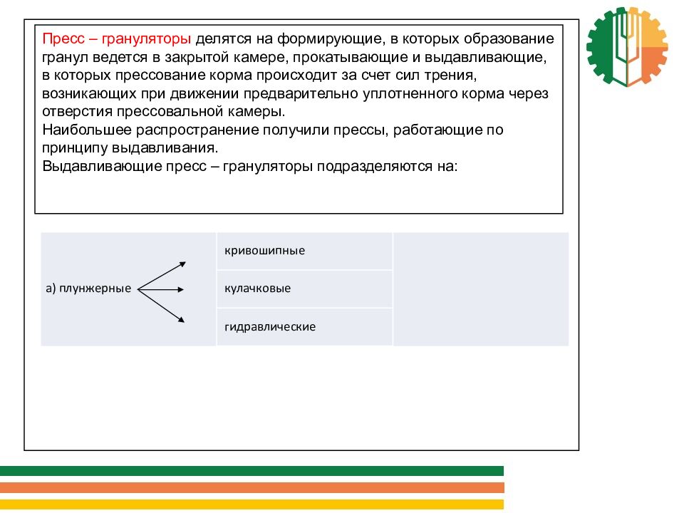 Пресс – грануляторы делятся на формирующие, в которых образование гранул ведется в закрытой камере, прокатывающие и выдавливающие, в которых прессование корма происходит за счет сил трения, возникающих при движении предварительно уплотненного корма через отверстия прессовальной камеры. Наибольшее распространение получили прессы, работающие по принципу выдавливания. Выдавливающие пресс – грануляторы подразделяются на: а) плунжерные кривошипные кулачковые гидравлические