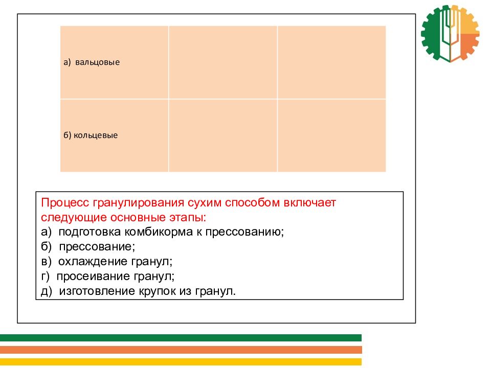 а) вальцовые б) кольцевые Процесс гранулирования сухим способом включает следующие основные этапы: а) подготовка комбикорма к прессованию; б) прессование; в) охлаждение гранул; г) просеивание гранул; д) изготовление крупок из гранул.