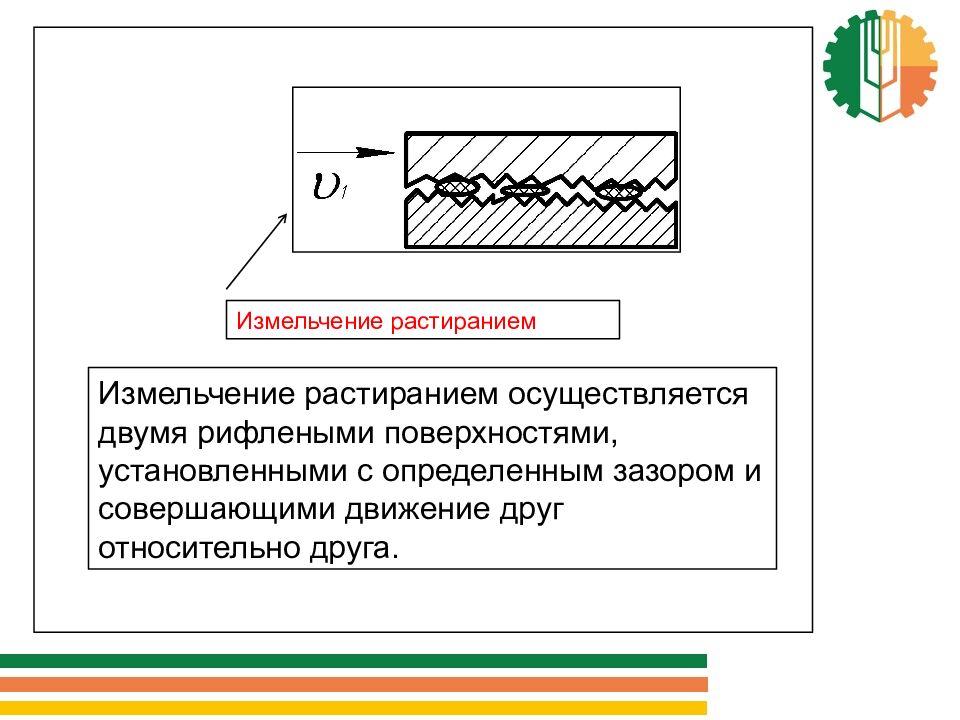 Измельчение растиранием Измельчение растиранием осуществляется двумя рифлеными поверхностями, установленными с определенным зазором и совершающими движение друг относительно друга.