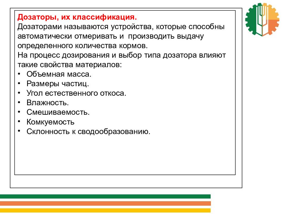 Дозаторы, их классификация. Дозаторами называются устройства, которые способны автоматически отмеривать и производить выдачу определенного количества кормов. На процесс дозирования и выбор типа дозатора влияют такие свойства материалов: Объемная масса. Размеры частиц. Угол естественного откоса. Влажность. Смешиваемость. Комкуемость Склонность к сводообразованию.