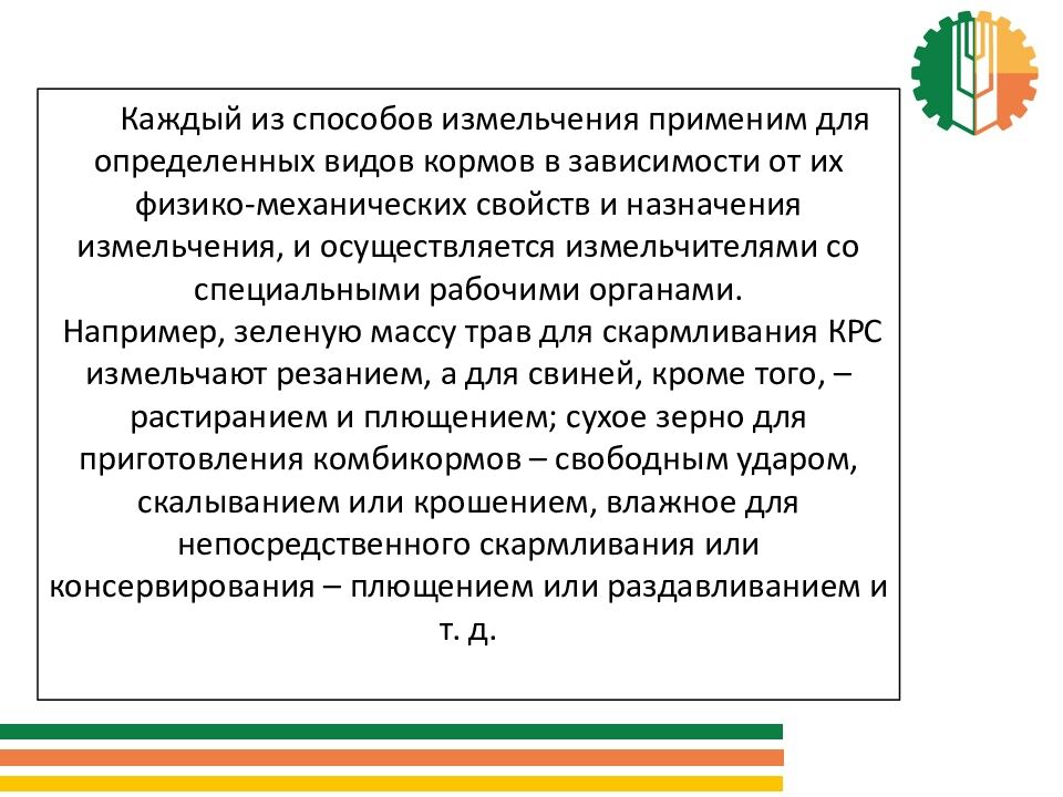 Слайд 10: Каждый из способов измельчения применим для определенных видов кормов в зависимости от их физико-механических свойств и назначения измельчения, и осуществляется измельчителями со специальными рабочими органами. Например, зеленую массу трав для скармливания КРС измельчают резанием, а для свиней, кроме того, – растиранием и плющением; сухое зерно для приготовления комбикормов – свободным ударом, скалыванием или крошением, влажное для непосредственного скармливания или консервирования – плющением или раздавливанием и т. д