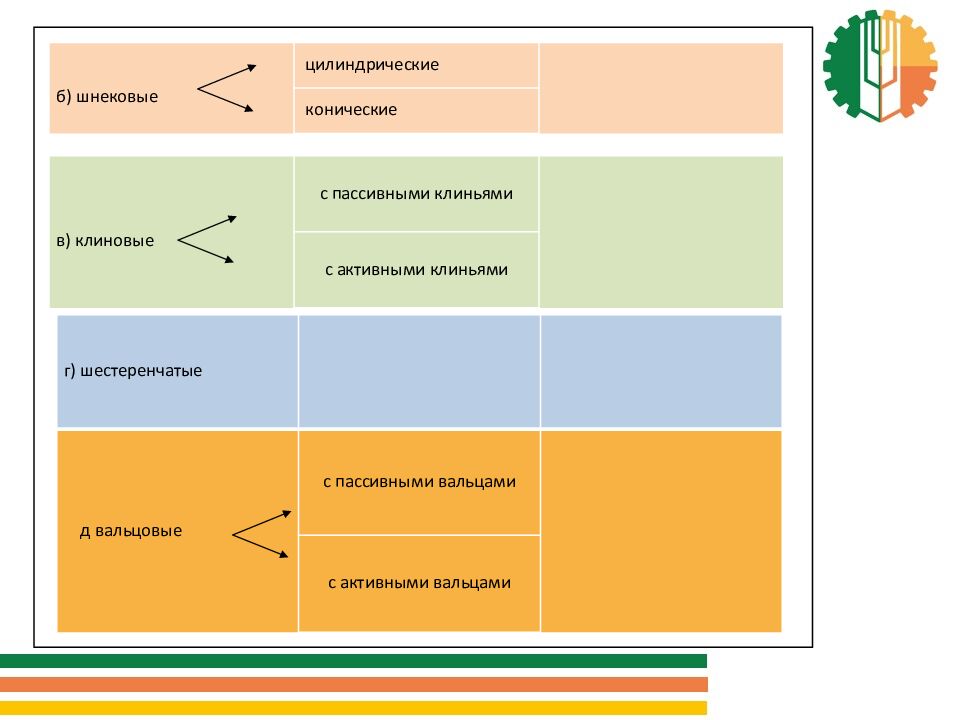 б) шнековые цилиндрические конические в) клиновые с пассивными клиньями с активными клиньями г) шестеренчатые д вальцовые с пассивными вальцами с активными вальцами
