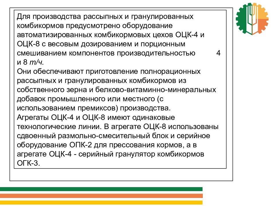 Для производства рассыпных и гранулированных комбикормов предусмотрено оборудование автоматизированных комбикормовых цехов ОЦК-4 и ОЦК-8 с весовым дозированием и порционным смешиванием компонентов производительностью 4 и 8 т/ч. Они обеспечивают приготовление полнорационных рассыпных и гранулированных комбикормов из собственного зерна и белково-витаминно-минеральных добавок промышленного или местного (с использованием премиксов) производства. Агрегаты ОЦК-4 и ОЦК-8 имеют одинаковые технологические линии. В агрегате ОЦК-8 использованы сдвоенный размольно-смесительный блок и серийное оборудование ОПК-2 для прессования кормов, а в агрегате ОЦК-4 - серийный гранулятор комбикормов ОГК-3.