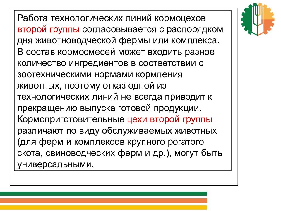 Работа технологических линий кормоцехов второй группы согласовывается с распорядком дня животноводческой фермы или комплекса. В состав кормосмесей может входить разное количество ингредиентов в соответствии с зоотехническими нормами кормления животных, поэтому отказ одной из технологических линий не всегда приводит к прекращению выпуска готовой продукции. Кормоприготовительные цехи второй группы различают по виду обслуживаемых животных (для ферм и комплексов крупного рогатого скота, свиноводческих ферм и др.), могут быть универсальными.